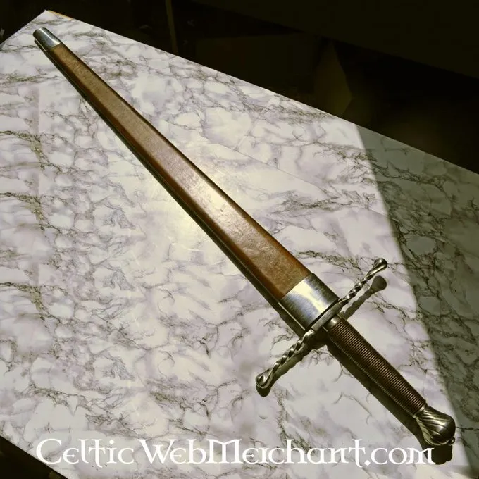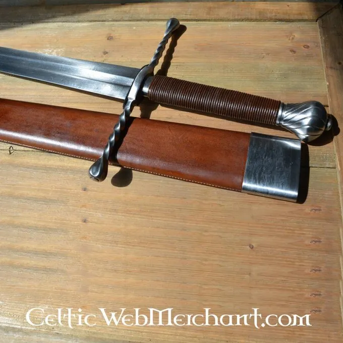 Dieses Anderthalbhandandschwert wird nach einigen spätmittelalterlichen Stücken gemacht. Es ist 118,5 cm lang, mit einer Klinge von 92,5 cm lang. Der Griff ist aus Holz gefertigt. Der Stahl Knauf und Parierstange sind kunstvoll gedreht und das Schwert einen eleganten Charakter verleihen. Die gelieferte Holz Scheide ist mit Leder bezogen