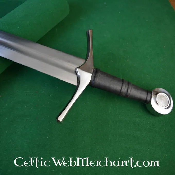 Produktdetails: Länge: 90 cm / Klingenlänge: 72 cm / Grifflänge: 12 cm / Klingen bei Parierstange: 5 cm / Gewicht: 1400 g / Stahltyp: EN45 Federstahl, Härte 48 HRC / Schneide: Halb scharf / Knauf: Screwed / Griffwicklung : Holz, Leder Eines / Auf der grun
