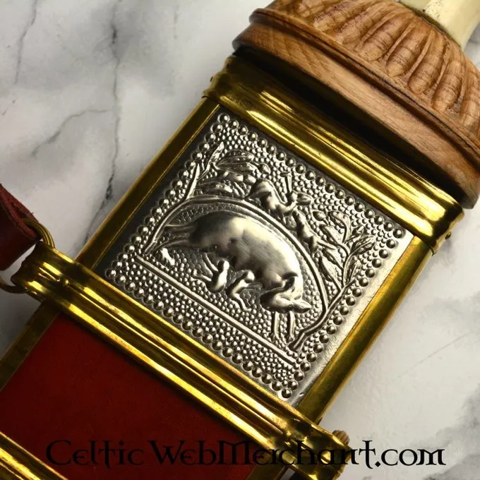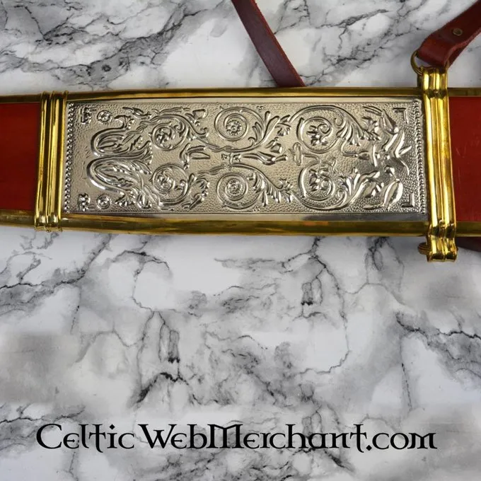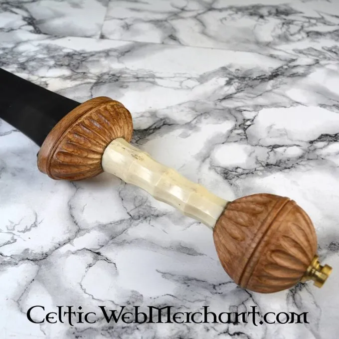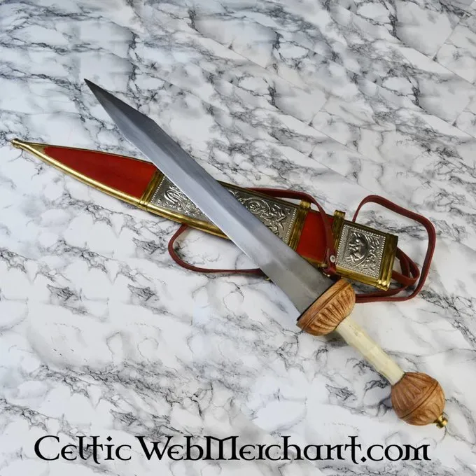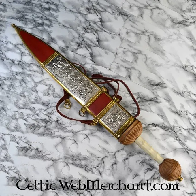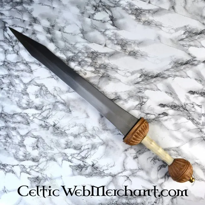 Das Gladius ist ein Nachbau eines Originals ausgegraben in Fulham, England. Das luxuriöse Gladius ist im Mainzeren Stil und hat einen verzierten Griff aus Knochen und Holz. Die Scheiden sind aus Holz mit Leder und verziert mit (versilbert) Messingarmatur überzogen. Dieses Gladius hat eine halb scharf Klinge aus EN45 Federstahl.