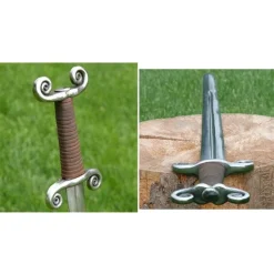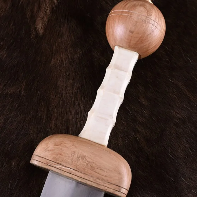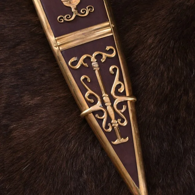Das Gladius ist kein Nachbau eines bestimmten Originals, hat aber Eigenschaften verschiedenen gladii aus dem ersten Jahrhundert nach Christus. des Fulham oder Fulham-Mainz-Typ mit einer langen geraden Klinge und lange scharf zugespitzten Spitze. Die Scheide, basiert jedoch auf einem historischen Original, nämlich auf Überreste einer Scheide in dem Schiffbruch von Porto Novo aus dem 1. Jahrhundert nach Christus, in der Nähe von Porto Vecchio auf Korsika gefunden. Die Scheide wird auch als Fulham-Mainz Übergangstyp aufgrund seiner Form und Größe gekennzeichnet ist. </ P>