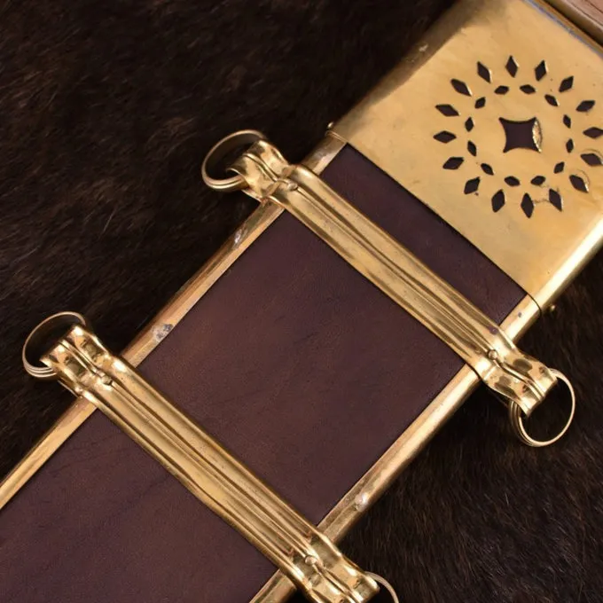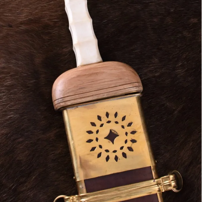 Dieses Gladius hat eine Klinge aus EN45 Federstahl. Es hat eine Fulltang mit verschraubtem Knauf. Der Griff ist aus Knochen und Holz und die Gladius kommt mit einem braunen Lederscheide mit umfangreichen dekorativen Replik Messingbeschlägen. Die Scheide hat auch Messingringe für die gladius an einem Gürtel befestigt wird.
