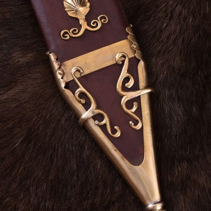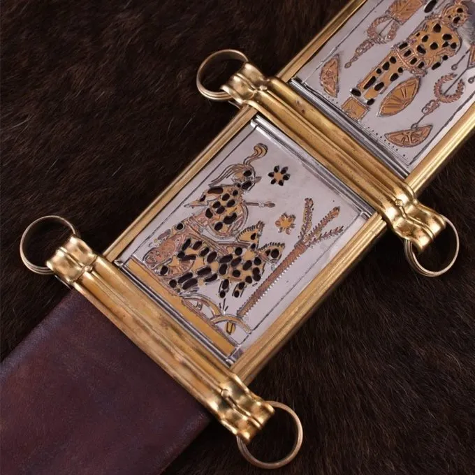 Das luxuriöse Gladius ist eine Bereicherung für Sammler von klassischen Waffen und für Roman Reenactor. Es hat eine Klinge aus EN45 Stahl und einen Griff Knochen und Holz mit einem verschraubten pommel. Es ist mit einem Holzkern mit einer Lederscheide geliefert. Die Scheide ist sehr schön mit Messingbeschlägen verziert. Die beiden Quadrate zeigen Krieg und Sieg Ikonographie. Der untere Quadrat zeigt eine voll bewaffnete Figur auf einem Wagen. Die Top-Platz zeigt eine voll bewaffnete Gestalt von siegreichen Ikonographie umgeben, wie Lorbeeren aus. Die untere Seite ist dekorativ, mit einer palmette und einer verzierten Scheide Spitze. Die Scheide hat Messingringe, so dass Sie es auf Ihrem Gürtel hängen.