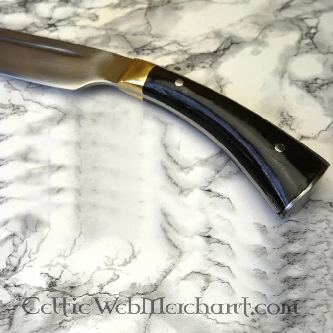 Produktdetails: Länge: 60 cm / Klingenlänge: 44 cm / Grifflänge: 16 cm / Klingen bei Parierstange: 5,5 cm / Gewicht: 1350 g / Stahltyp: EN45 Kohlenstoffstahl / Schneide: halb scharf / Tang-Konstruktion: Voll Tang-Konstruktion / Griff: Horn, Messing / Auf