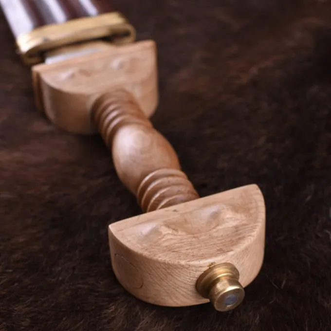 Diese Spatha ist keine exakte Kopie von 1 particular Museumsstück, aber es basiert auf Original-Überreste von mehreren Spathas aus dem zweiten Jahrhundert nach Christus. die in dem Limesmuseum in Aalen, Deutschland ausgestellt. Vom Ende des zweiten Jahrhunderts begann die Spatha Popularität unter den römischen Legionäre und auxiliae zu gewinnen, auf Kosten des Gladius. Die Spatha war viel länger als die Gladius, so war es auch perfekt für die Kavallerie-Truppen. Die Infanterie trug die Spatha auf der rechten Seite und die Kavallerie es auf der linken Seite durch. Diese spatha hat einen schönen Holzgriff und einen verschraubten Knauf. Es ist mit einem Holzkern mit einer Lederscheide geliefert. Die Scheide hat einen schönen Messing Gurtschlaufe (für Gürtel bis zu 5,5 cm breit) und Messing-Armaturen auf der Ober- und Unterseite.