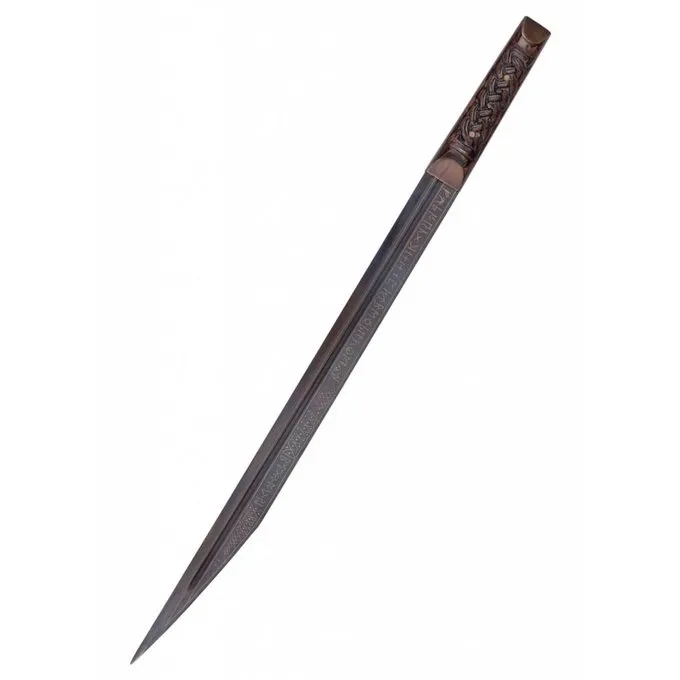 Dieses Seax ist eine Replik eines neunten Jahrhundert ursprünglich in der Themse in der Nähe von London ausgegraben im Jahr 1857. Es ist derzeit ein Teil der Sammlung des British Museums ist. Dieses dekoriert Seax ist mit Runen auf einer Seite verziert. Es zeigt die komplette Rune Alphabet. Die andere Seite zeigt den Namen Beagnoth, der möglicherweise der Hersteller oder Besitzer des Seax war. Genau wie das Original der Gravur dieser Seax mit Gold und Silber Einlageed. Die Klinge ist brüniert. Der Griff hat zwei Messingringe und die Seax wird mit einer Anzeige geliefert diese schöne Replik zu zeigen.