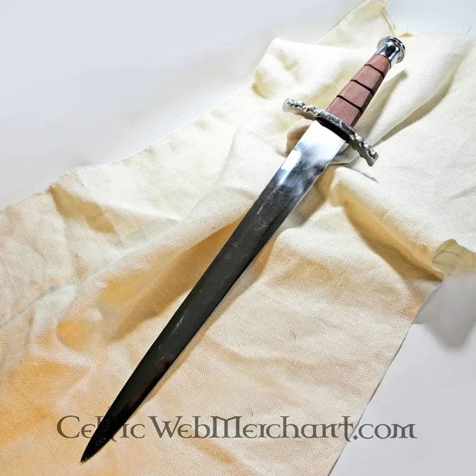 Schwerter wie diese wurden oft in Kombination mit Speer Formationen sheltron. Wenn der Speer einen Soldaten aus dem sheltron brach konnte das kurze Schwert ziehen und den Feind schwere Kavallerie auf dem Boden angreifen. Die kurze Scottish Schwert hat eine Länge von 55,50 cm und einer Klinge von 40 cm. Es wird mit einer Scheide geliefert.