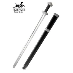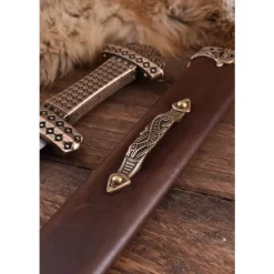 Dieses Wikingerschwert ist eine Nachbildung eines Schwertes aus dem 11. Jahrhundert, das in einem Sumpf in der Nähe von Dybek in Schweden gefunden wurde. Das Original ist im Historiska Museet in Stockholm ausgestellt. Es ist ein Petersen Typ Z. Der Knauf und der Kreuzschutz sind reich mit Vögeln, Schlangen und Ranken im Winchester-Stil verziert und machen das Schwert vielleicht zum schönsten ausgegrabenen Wikingerschwert in Skandinavien. Archäologen vermuten, dass das Schwert aus England stammt oder auf englischen Metallarbeiten basiert. Das Schwert war wahrscheinlich wegen ihres engen Kontakts mit England im Besitz eines Wikingeradligen. Die starke Klinge besteht aus gehärtetem EN45-Kohlenstoffstahl und ist breiter. Die Kante ist 1 mm dick, so dass Sie das Schwert auch stumpf oder gestochen scharf machen können. Der gelappte Knauf wird gestrahlt, der Griff wird mit Messingdraht umwickelt und der Zapfen setzt sich im Knauf fort. Das Schwert wird mit einer wunderschön dekorierten Scheide geliefert, die Sie an Ihren Gürtel hängen können. Die ursprüngliche Methode zur Herstellung von Damaststahl aus Wootz-Stahl ging in der Neuzeit verloren. Heutzutage wird der Name Damaststahl als Oberbegriff für mustergeschweißten / laminierten oder geschmolzenen Stahl aus zwei oder mehr verschiedenen Stahlsorten verwendet.