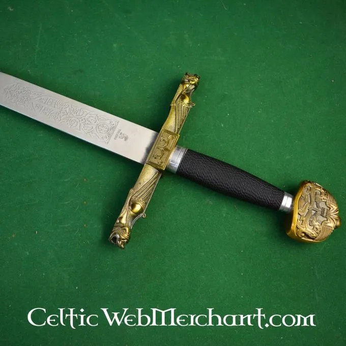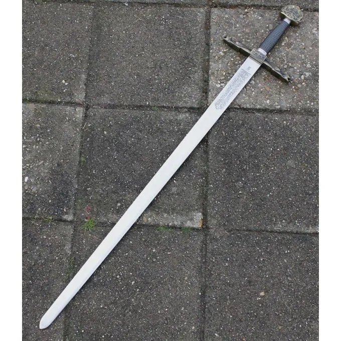 Dies ist ein wunderschön gestaltetes Schwert mit einer gravierten Klinge, Knauf und Parierstange. Der Griff ist mit Messing-Details fertig. Die Länge des Schwertes ist 100 cm. Es ist aus Toledo Stahl.