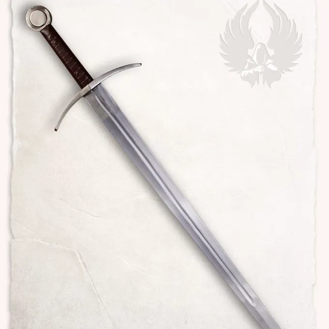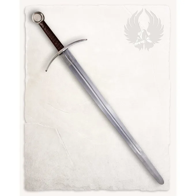 Dieses Schwert basiert auf Originalen aus dem 14. Jahrhundert. Es hat einen runden Knauf und einen leicht gebogenen Querschutz. Der Griff ist mit Leder umwickelt.