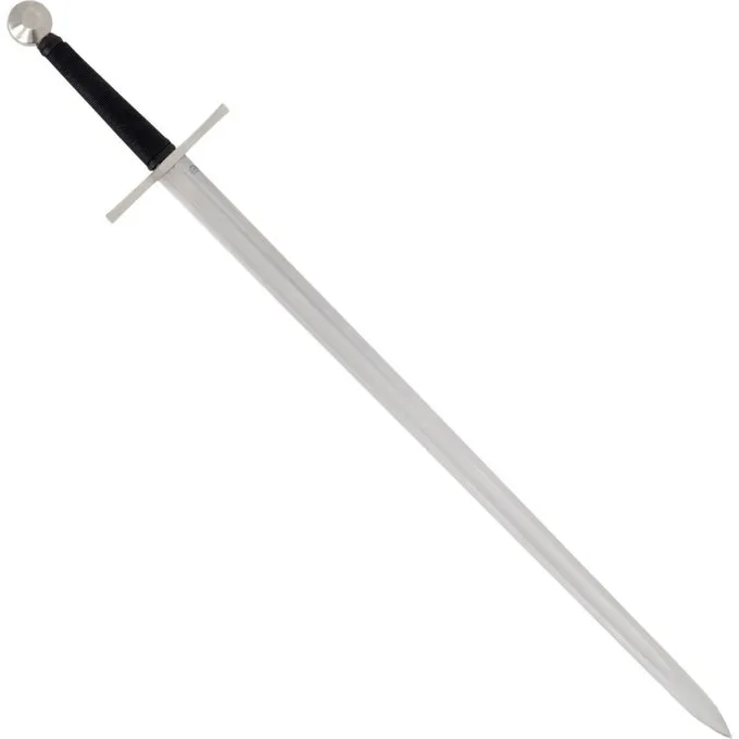 Dieses Schwert ist eine Nachbildung eines Oakeshott Typ XVII. Diese Art von Schwert war von etwa 1355 bis 1425 beliebt. In dieser Zeit nahm die Zahl der Fußsoldaten und Bogenschützen in Armeen zu. Die schwer gepanzerten Ritter der Elite trugen Beilagen als zusätzlichen Schutz gegen Fußsoldaten und Bogenschützen. Infolgedessen wurden die Schwerter, die in dieser Zeit hergestellt wurden, zum Stoßen zwischen die Panzerplatten konstruiert. In dieser Zeit kamen auch Waffen wie der Kriegshammer und der Streitkolben zum Einsatz, bei denen es sich um Waffen handelte, die Rüstungen schwer beschädigen konnten.